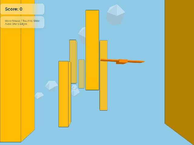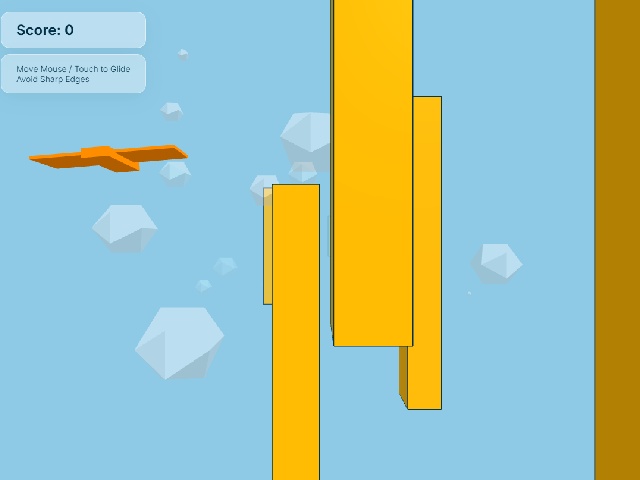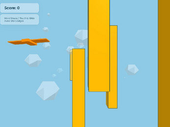 3D Vero Plane is a three-dimensional arcade game about flying through obstacles. The player controls a small aircraft by moving the mouse across the screen. The goal is to avoid orange monoliths with sharp edges. Points are awarded for each monolith passed and flight speed gradually increases. The game ends upon colliding with any obstacle.