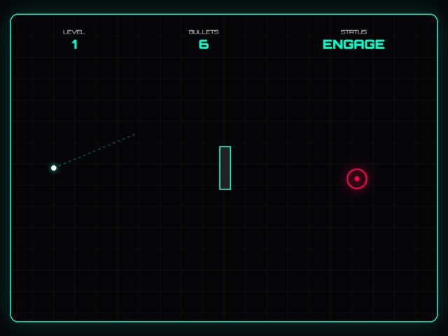 The player controls a white bullet ball, which must be launched in such a way as to hit the enemy red drone. To fire, you need to hold and drag the cursor, setting the direction and force of the bullet. The bullet can bounce off walls and rectangular obstacles along the way. The level is passed if the bullet hits the target before the limited supply of ammo is exhausted. With each new level the number of obstacles increases, making the task more difficult