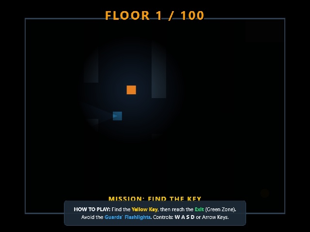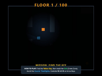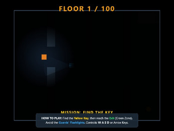 Atom Escape is a stealth game about escaping from a secret floor. The player must find the yellow key and reach the green exit. Guards patrol the floor with flashlights and vision cones. Player visibility is limited to the light radius around the character. Guards move horizontally or vertically at varying speeds. The player loses if caught in their field of view. Difficulty increases with each floor as new guards appear.