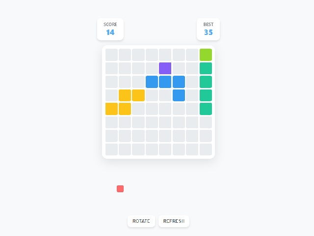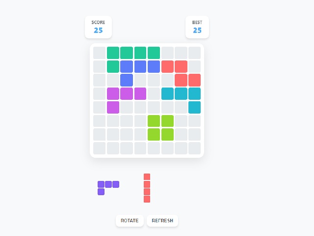 Block Puzzle Strat is a game of placing shapes on an eight by eight grid. The player drags colored blocks from the bottom panel onto the game board. Each shape consists of one or more connected squares. Fully filled rows or columns disappear and award bonus points. The game ends if none of the available pieces can be placed. Buttons for rotating shapes and refreshing the set of blocks are available.