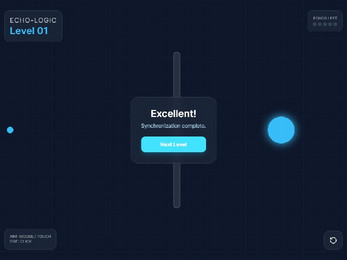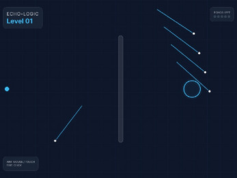 Echo Logs is a minimalist game about reflecting signals through an obstacle maze. The player fires pulses from the left side of the screen toward targets in space. Signals bounce off walls and obstacles gradually losing energy. Each level has a limited number of pulses to hit all targets. The level is complete when all targets are illuminated in blue.