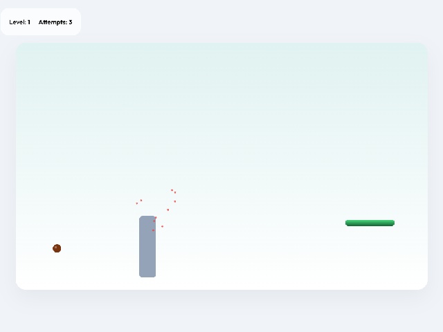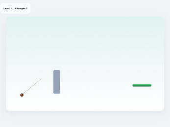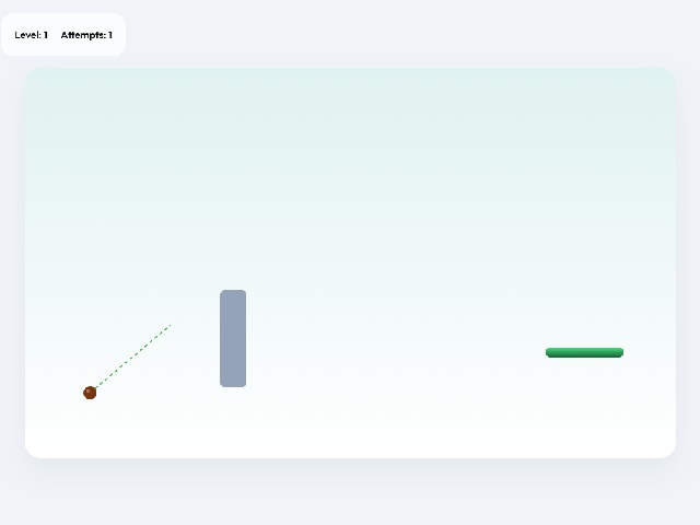 Eco Shift is a minimalist physics puzzle about launching a seed toward a goal. The player drags the mouse from the seed to set force and direction. The seed flies under gravity and must land on the green platform. Concrete obstacles block the path and reset the level upon collision. Difficulty increases with each level as new obstacles are added.