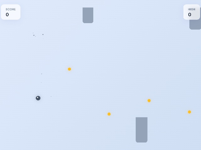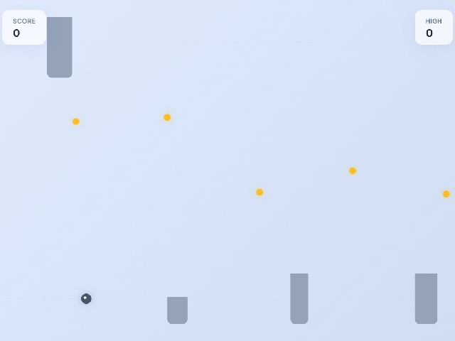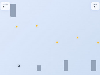 Grav Bloom is a game about collecting particles with gravity switching in two corridors. The player controls a dot that moves between upper and lower zones by tapping the screen. Yellow spheres award points while gray obstacles end the game upon collision. Movement speed gradually increases creating additional challenge. The game ends upon touching an obstacle and displays the final score.