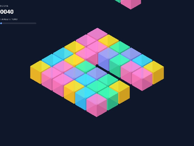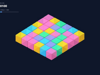 IsoMatch 3D is a three-dimensional match three game on a six by six isometric grid. The player swaps adjacent cubes to form lines of three matching colors. Each match awards points and triggers a vanishing animation with new cubes appearing. The goal is to reach one thousand points to win. The grid rotates creating a sense of depth and volume.