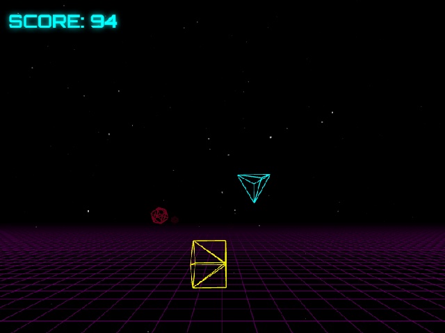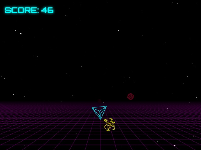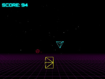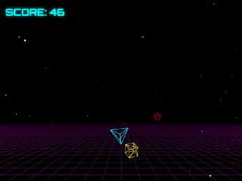 The player controls a glowing pyramid shaped ship in three dimensional space. Ship movement is done by moving the mouse or dragging a finger across the screen. When clicking or tapping the ship fires a green laser beam forward. The laser destroys enemy objects flying toward you from various directions. Destroying each enemy awards bonus points on top of the base score. Colliding with any enemy object instantly ends the game. Stars and a rotating grid fly around creating a deep space effect. Perfect choice for space arcade fans and reaction training.