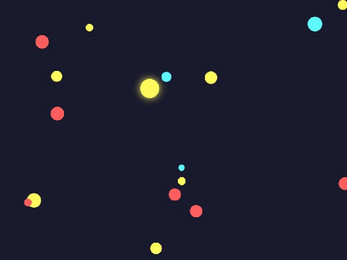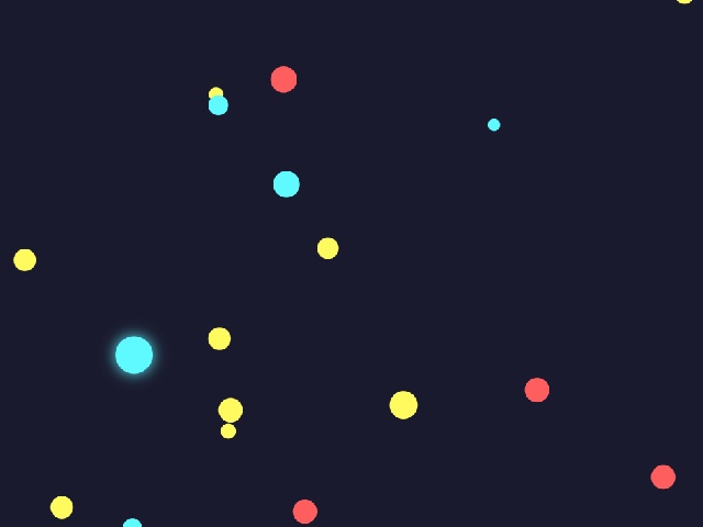 The player controls a circle that changes color with every screen tap or mouse click. Movement is done by dragging your finger or cursor across the field as the circle attracts to that point. Colored particles appear on the field and must be absorbed only when matching the circles current color. Absorbing a matching particle restores energy and awards points. Colliding with a particle of a different color drains energy and pushes the player back. The game ends when energy reaches zero. Control your circles color and collect only matching particles to survive as long as possible.