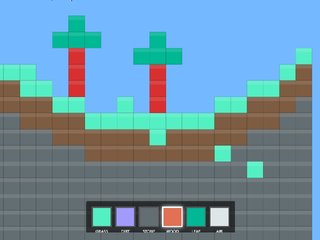 mc2d is a two dimensional sandbox inspired by a classic building game. You can create and destroy blocks using the left mouse button and the toolbar. The world is procedurally generated with hills trees and different ground types. You can move the camera by holding the right mouse button and zoom with the scroll wheel. Explore the landscape build structures and create your unique world.