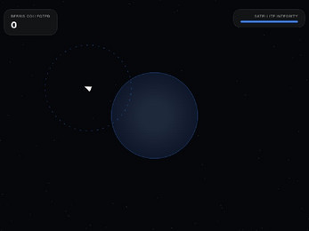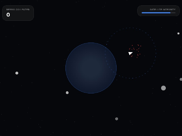 Orbit Cleaner is a game about collecting space debris in planetary orbit. The player controls a satellite that moves in a circle around the planet following the mouse. A gravity beam activates on click and pulls debris toward the satellite. Debris must be directed into the planet's atmosphere for destruction and points. Debris hitting the satellite reduces energy and leads to failure.