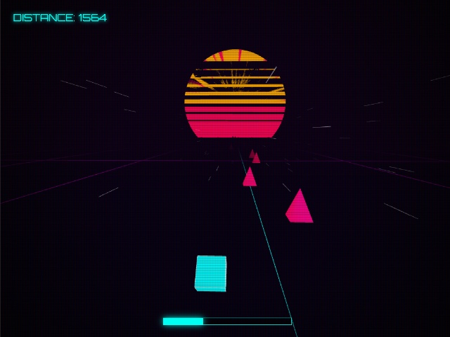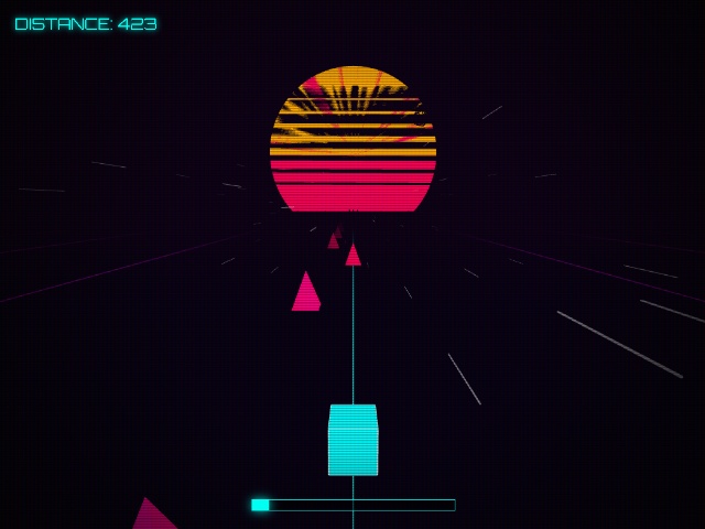 RIO Neon Rush is an atmospheric endless runner in the synthwave style. The player controls a neon cube, maneuvering between obstacles on a three-lane track under the retro 80s sun.