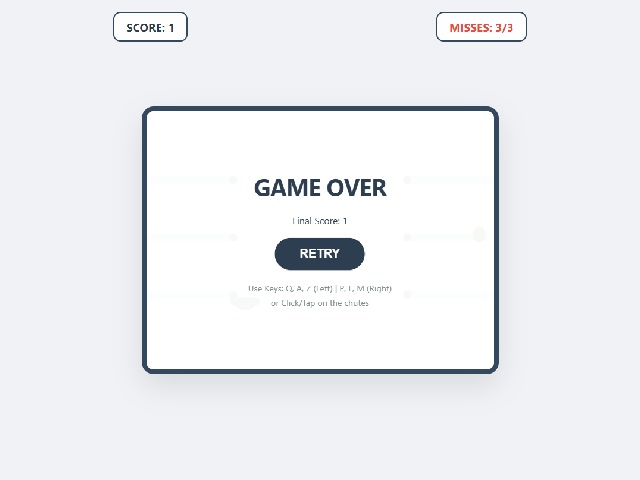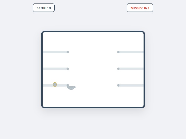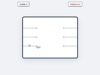 Vero Eggs is a dexterity game where you need to catch eggs with a basket on six chutes. The player moves the basket by pressing keys or touching the screen in the correct zone. Eggs roll down the chutes from top to bottom with increasing speed. A basket catch increases the score while a miss adds to the miss count. The game ends after three misses.